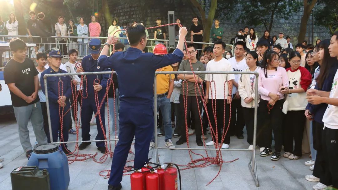 本次演练活动设置了多个应急处置场景,包括火灾现场自救逃生技能讲解、人员密集场所应急疏散、灭火器实操培训、消防结绳技巧等场景。