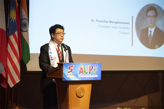 在开幕式上,泰国暹罗大学校长蓬猜·蒙空瓦尼(Pornchai Mongkhonvanit)主持并致欢迎词,他表示,在当前这个快速变化的环境中,高等教育需要积极应对挑战,重新思考和设计教育模式,以更好地适应社会的发展和学生的需求。